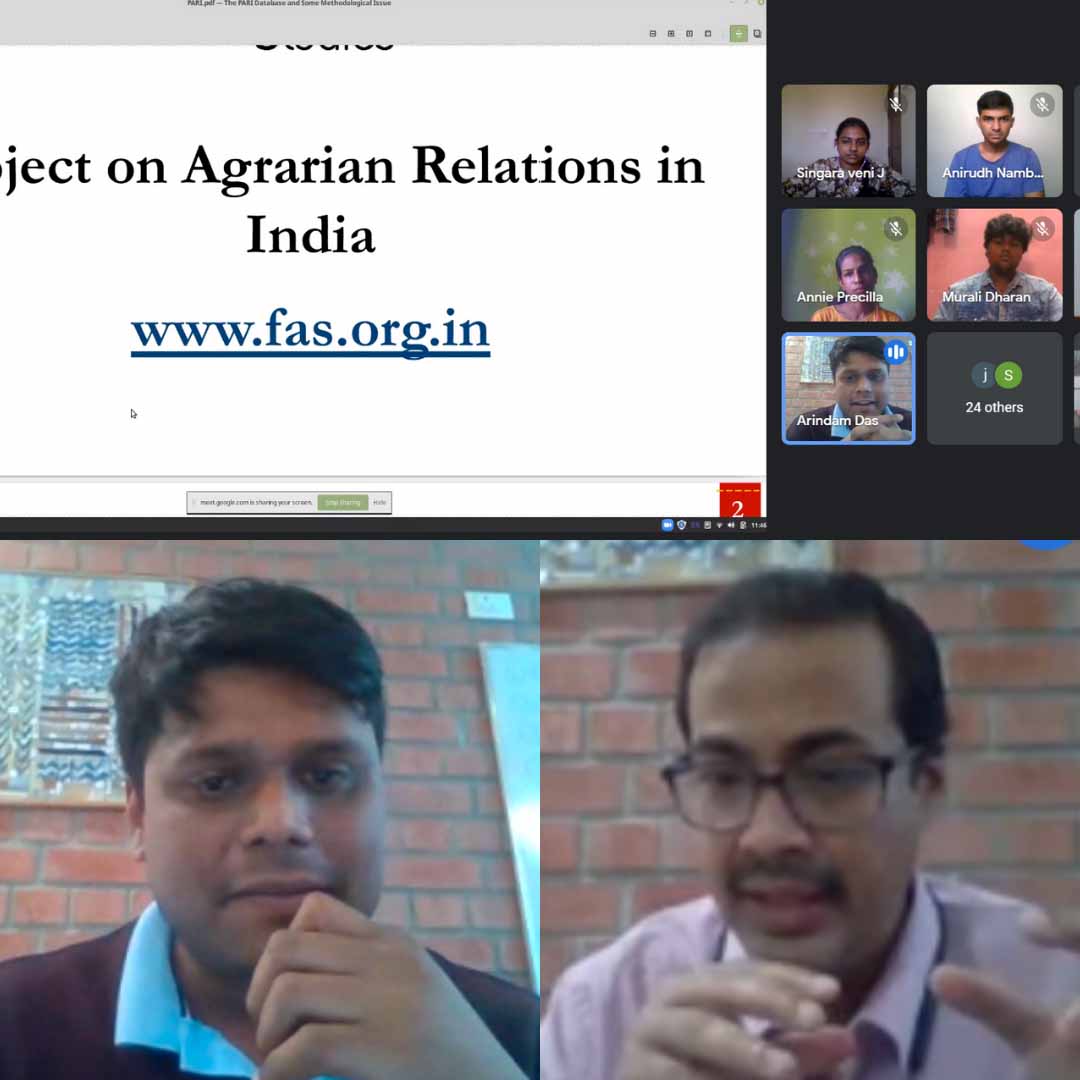 It began with Sandipan Baksi, providing a broad overview on the different research problems, and other activities that FAS is engaged in, and their relevance to the idea of development. He also spoke about the opportunities for young students and scholars to work with FAS. Arindam Das, shared a few insights from the Project on Agrarian Relations in India, the village studies programme of FAS, He discussed the different ways in which the data for village studies can complement secondary data collected through large scale official surveys. Arindam also highlighted the scope for further research, and encouraged the students to consider some of these as in future. There was also a brief discussion on the recently established Pandemic Studies Unit of FAS.