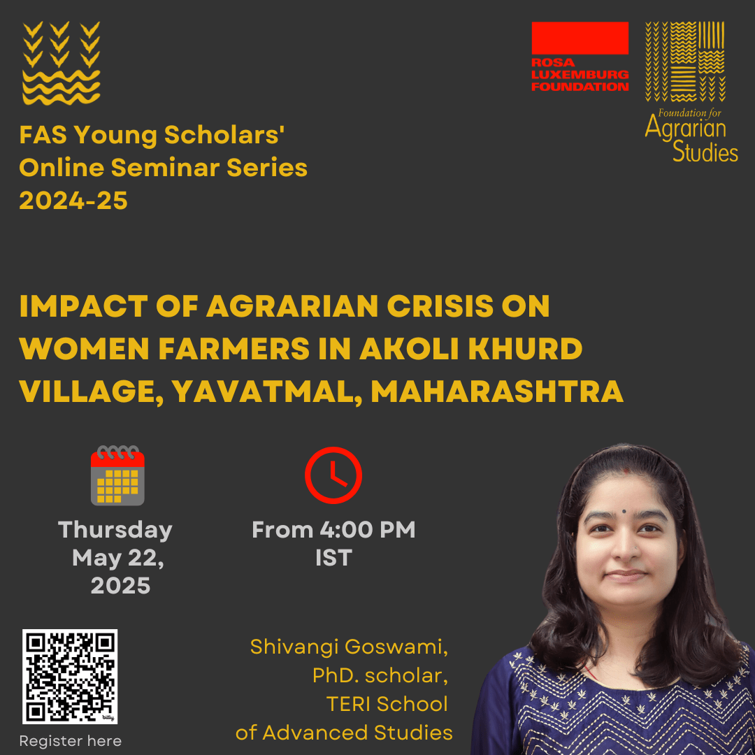 Shivangi’s study explores multifaceted challenges faced by women farmers in the context of the agrarian crisis in Akoli Khurd village, Yavatmal district, Vidarbha region, Maharashtra—an area known as the epicentre of farmer suicides. The research focuses on their lived experiences through the crisis, the coping mechanisms they adopt, and the effectiveness of various policy interventions. Using a qualitative ethnographic approach, the study employs participant observation, in-depth interviews, and focus group discussions to gain a nuanced understanding of women farmers’ challenges and struggles.