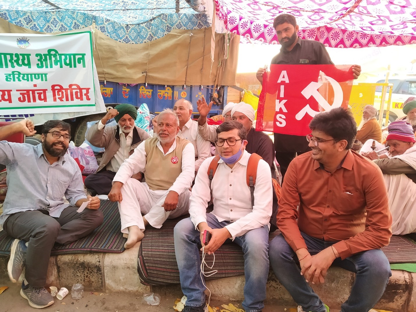 Dr Aazad Singh, retired from the Haryana government health department and now a part of the Peoples’ Health Movement, along with his retired pharmacist colleague, runs a small medical camp near the “Metro Pillar No. 795”, a location that has become famous because of the quality of the services at the medical camp. They attend to approximately 200-300 farmers a day for various kinds of health issues, many related to infections from sitting outside in the cold. Medicines are provided free of cost. The health risks in a Covid-19 pandemic are high, and Dr. Singh says the government and local authorities need to ensure a supply of Covid-19 tests at the site.