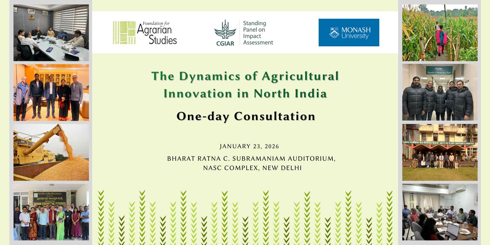 On Friday, January 23, 2026, the Foundation for Agrarian Studies (FAS), in collaboration with Monash University, Australia, and ICAR-National Bureau of Plant Genetic Resources (NBPGR), organised a one-day consultation at the National Agricultural Science Complex (NASC), New Delhi. The consultation was part of the research project, “The Dynamics of Agricultural Innovation in North India,” funded by CGIAR-Standing Panel on Impact Assessment (SPIA). The project aims to comprehensively document CGIAR-related innovations in North India since 2000, and study the reach and adoption of a select few innovations that have achieved scale.
